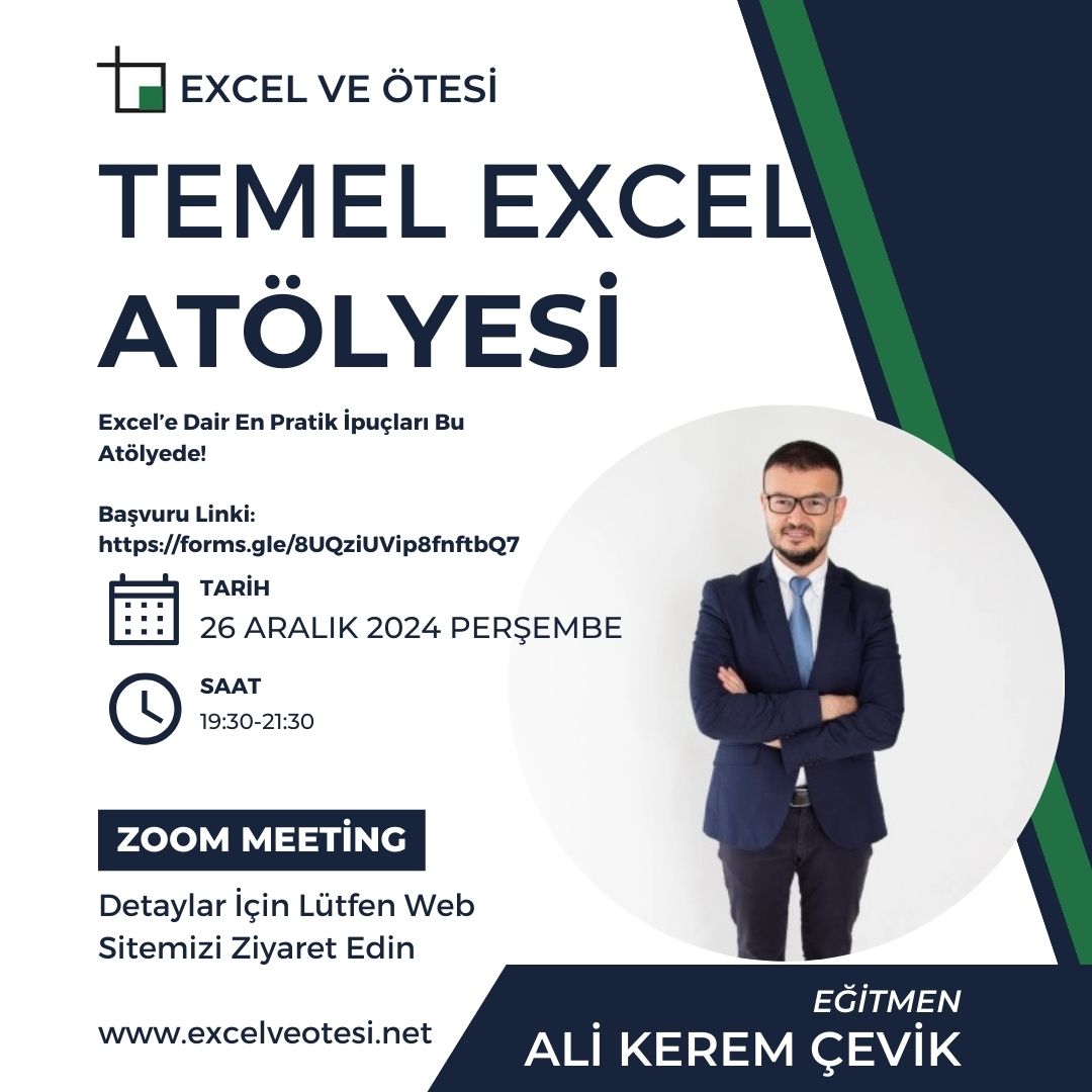 Ücretsiz Temel Excel Atölyemiz Başlıyor 23 Aralık 2024Excel ve Ötesi Yorum yapın Online atölyelerimiz başlıyor. 26 Aralık Perşembe Akşamı 2 Saatlik Temel Excel Atölyesi İle Excel’e dair önemli ipuçlarını sizlerle paylaşacağım. Atölyeye katılmak için lütfen aşağıdaki bağlantıya tıklayarak formu doldurunuz. https://forms.gle/8UQziUVip8fnftbQ7 Bunu paylaş: X'te paylaşmak için tıklayın (Yeni pencerede açılır) X Facebook'ta paylaşmak için tıklayın (Yeni pencerede açılır) Facebook Pinterest'te paylaşmak için tıklayın (Yeni pencerede açılır) Pinterest Beğen Yükleniyor... İlgili